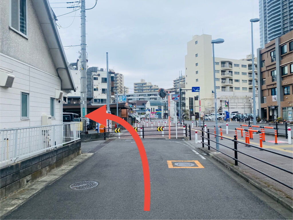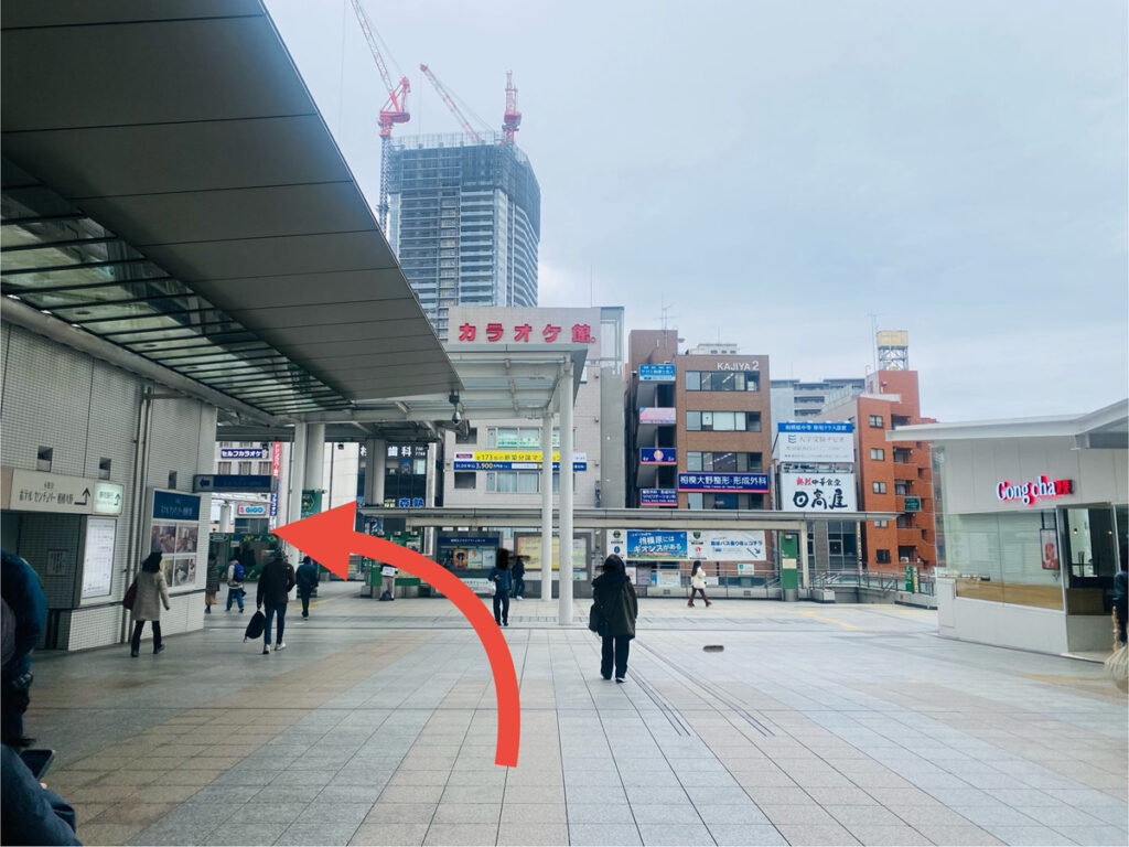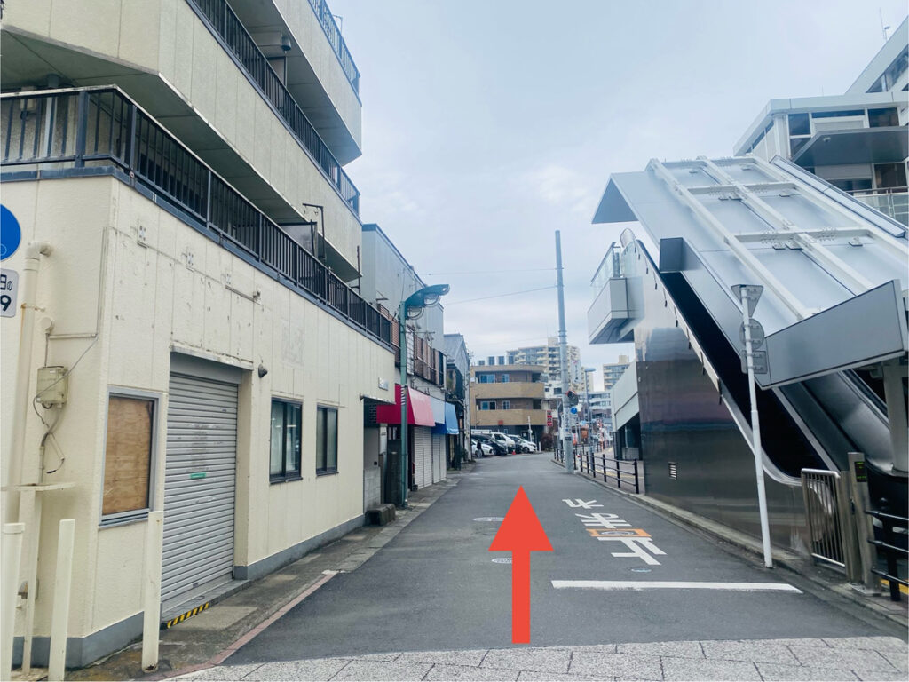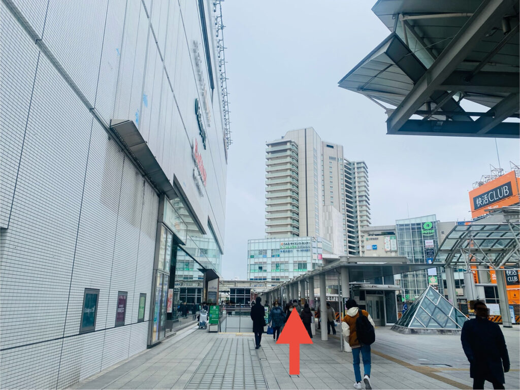 駅ビルまで来たら駅ビルの間の道をそのまま直進します。
