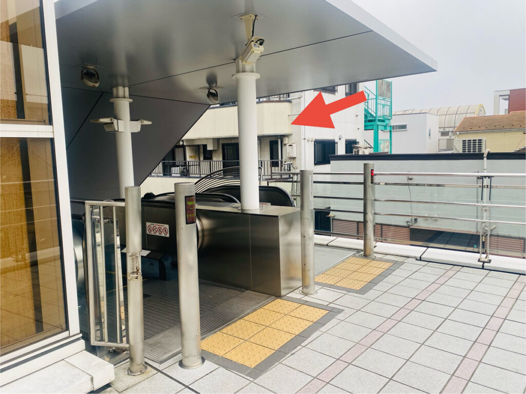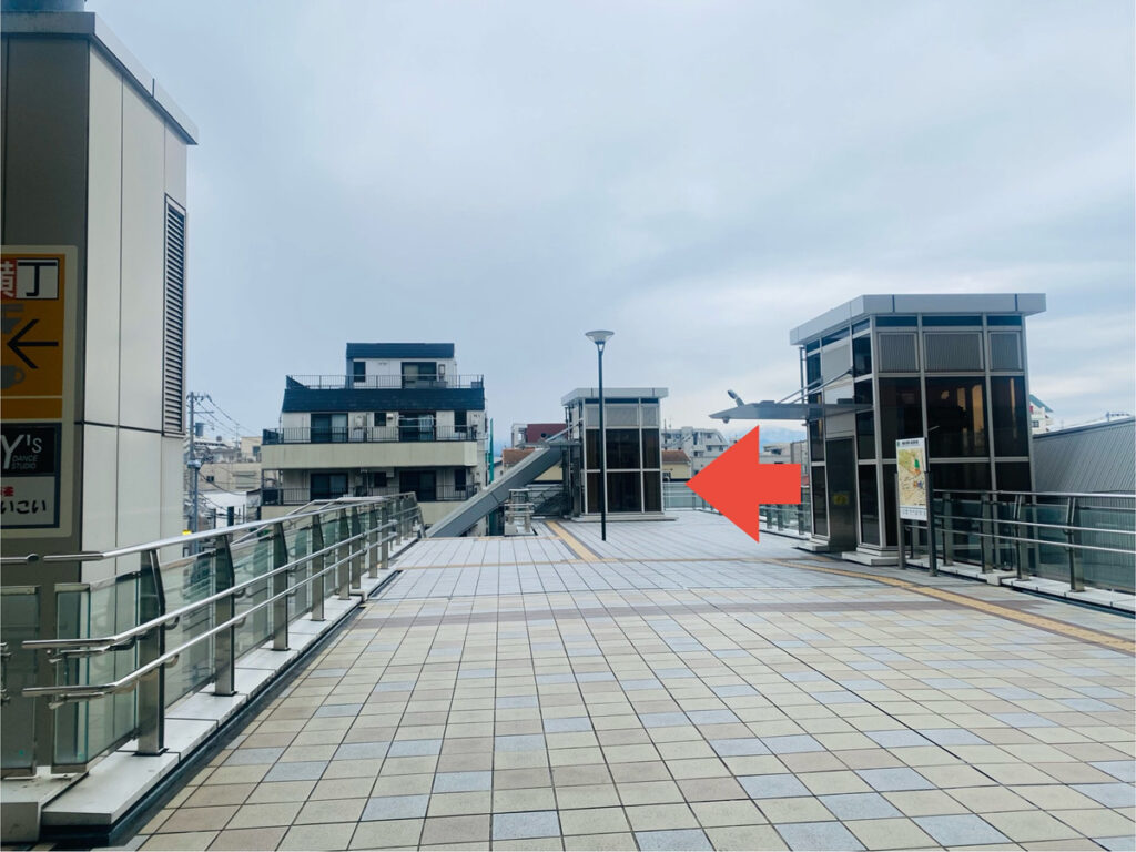 まっすぐ行くと駅ビルが終わり踊り場がでてくるので下りエスカレーターを目指します。