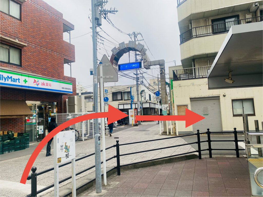 下につくと正面にファミリーマートが見えるのでファミリーマートをぐるりと右へいきます。