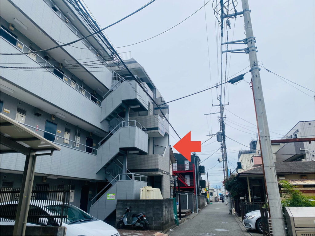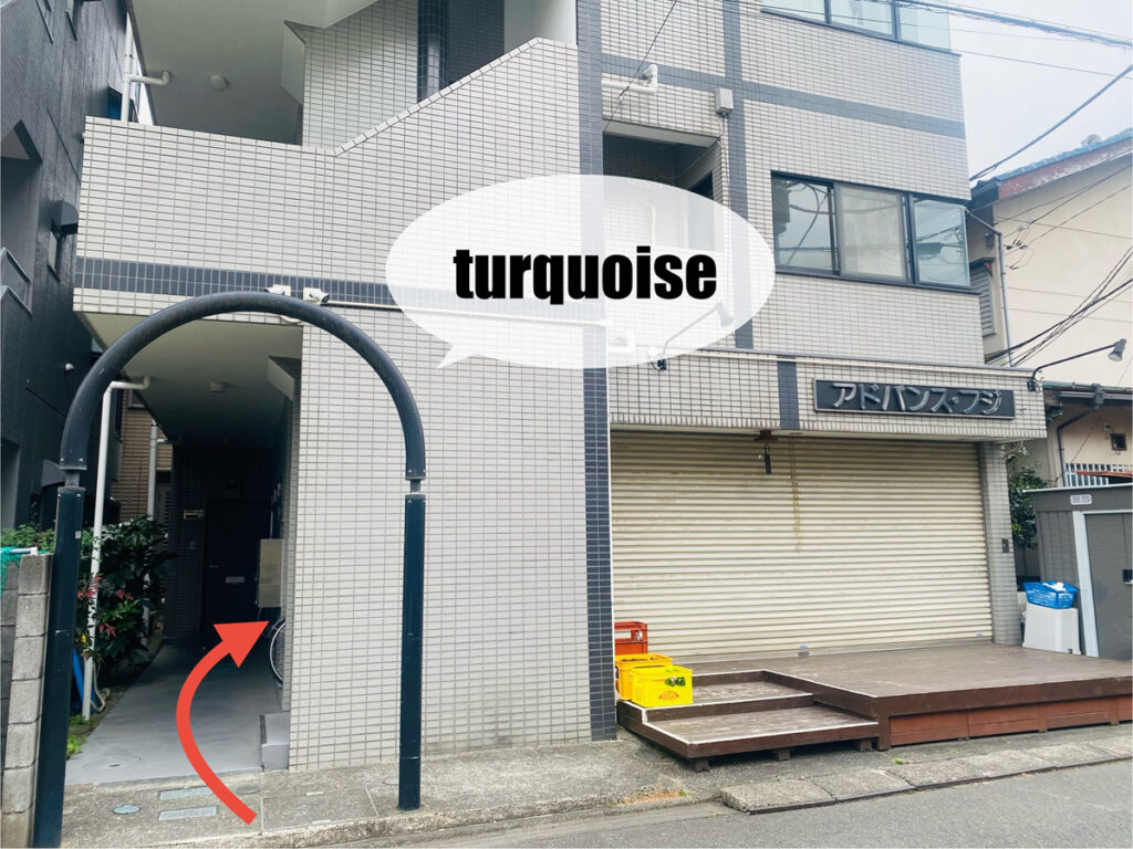 個人宅3軒過ぎると左側にグレーの建物が2軒出てきます。2軒目がターコイズのがある建物です。